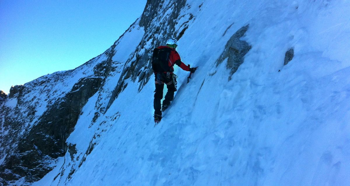 Wir erreichen den Wandfuß bei Dämmerung. Rosa und hellblau verfärbt, bietet der Himmel einen Kontrast zur majestätisch aufragenden schwarz-weißen Nordwand. Fünf Lichter bewegen sich langsam vom Einstieg in den sich aufsteilenden Firn. Wir lassen unsere Skier zurück und stapfen mit Steigeisen und Eisgeräten bewaffnet los. Der Schnee ist griffig und wir sind schnell unterwegs. Beim ersten Felsenaufschwung holen wir eine Dreiergruppe ein und ziehen beim ersten Stand an ihnen vorbei. Sichern brauchen wir nicht, das Eis ist ein Traum und die Felsen dazwischen frei von Schnee. Das zweite Firnfeld überqueren wir linkshaltend und erreichen den zweiten Aufschwung. Es bietet sich eine Henkelparade, die fast ohne Pickeleinsatz überwunden werden kann. Wieder ein Schneefeld. Beim Queren brennen die Waden. Umso besser, dass der letzte Felsriegel vor uns liegt.