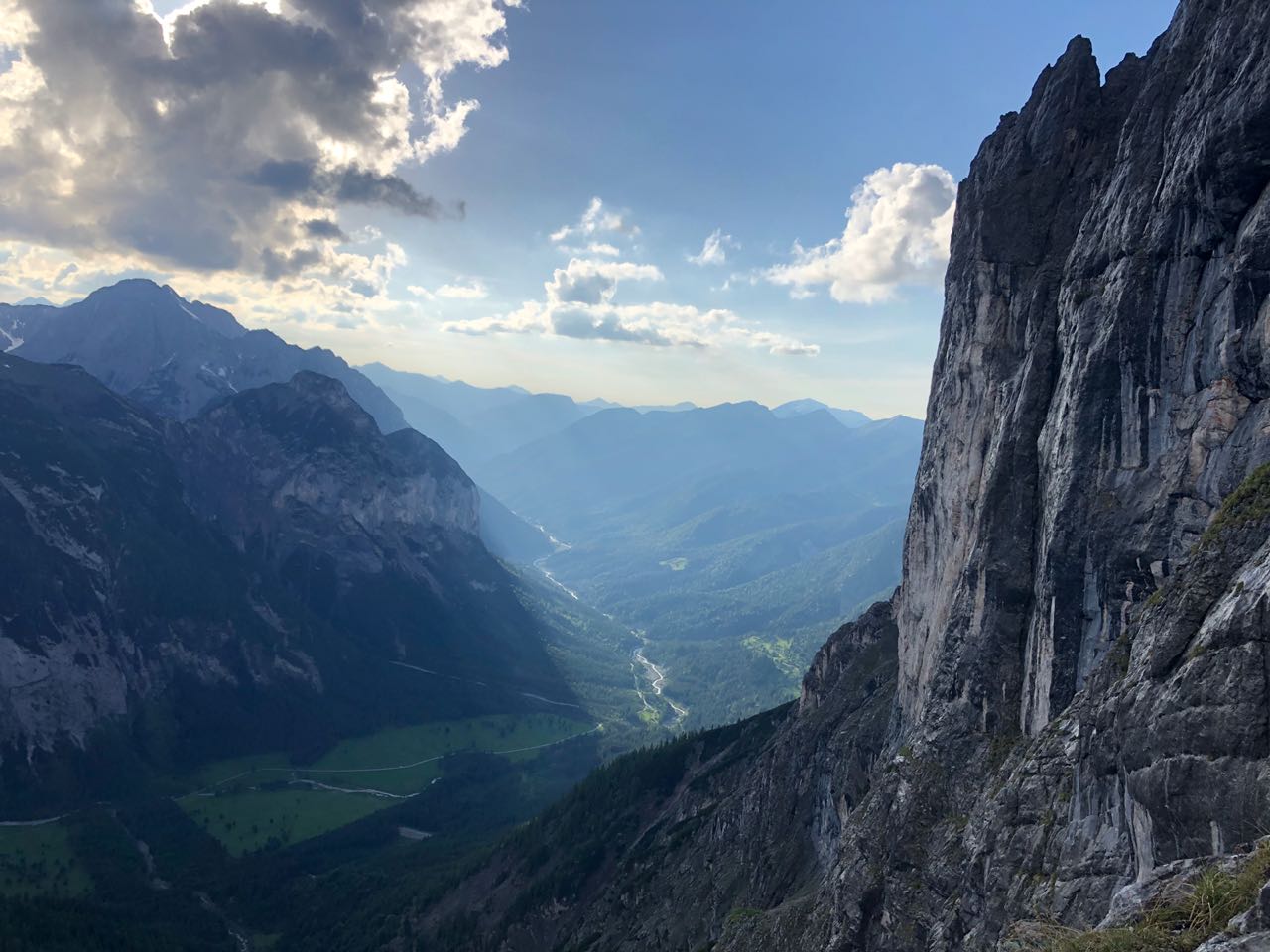 Die letzten und schwierigsten Längen waren meine. Die Härteste davon war mit 9- bewertet und forderte eine exakte Fußtechnik. Zum Greifen gab es durchgehend nur ganz kleine Leisten und das an sehr undurchsichtigem grauen Fels, an dem alles gleich aussah. Einmal mit rechts einen flachen 2-Finger-Steller und dann zum guten Loch! Jetzt folgte noch eine 8- Platte mit einem seichten Stützer und anschließend Reibungsklettern wie auf rohen Eiern! Aber auch diese Herausforderungen konnte ich im Onsight bewältigen. Am höchsten Punkt bot sich eine tolle Aussicht rüber zu den Laliderer Wänden, die aus den sattgrünen Almweiden steil aufragten.