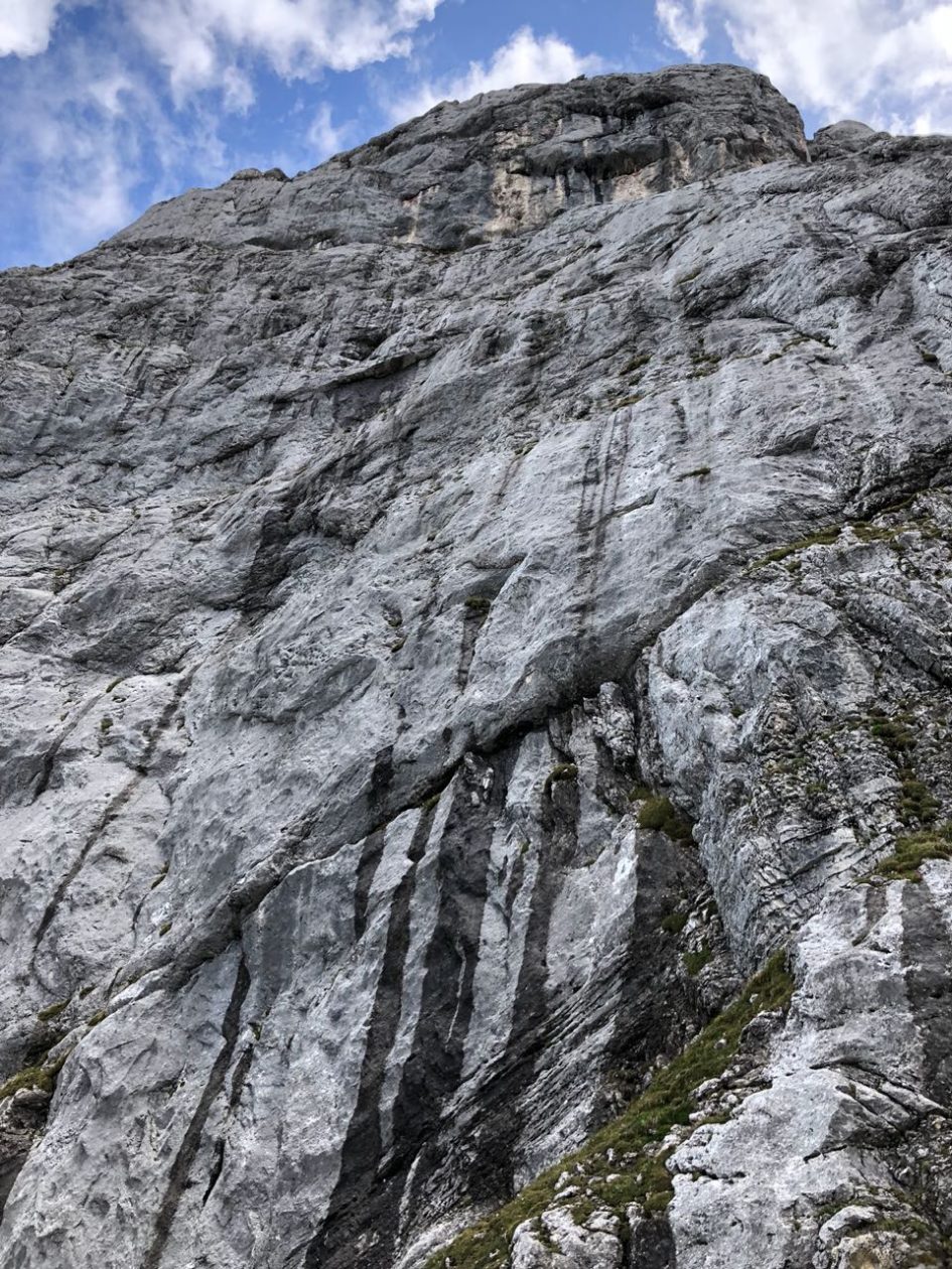 Vergangenes Wochenende war ich mit Therry und Caro im Karwendel unterwegs. Vom Falzthurntal stiegen wir mühsame 1,5 Stunden mit dem schweren Kletterzeug bis zum Fuße der Westwand der Schaufelspitze auf. Hier zieht eine 300m Kalkwand, durchzogen von dunklen Wasserstreifen, senkrecht empor. Trotz der nassen Flecken stiegen wir in unsere Route ein, die durch den kompakten zentralen Bereich der Wand führt.