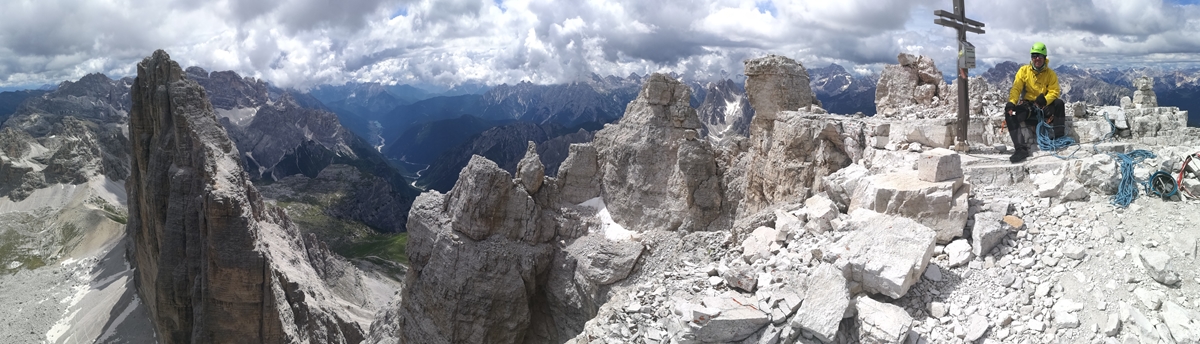 Kurz darauf erreichten wir den Gipfel mit atemberaubendem Tiefblick in die Nordwand der Großen Zinnen. Für mich sind diese Berge ein einzigartiger Ort voller Kraft. Da ich auf der mittleren Zinne schon vor einigen Jahren gestanden hatte, habe ich nun alle drei Gipfel bestiegen! Und die Nordwände lassen bestimmt auch nicht mehr lang auf sich warten… 🙂