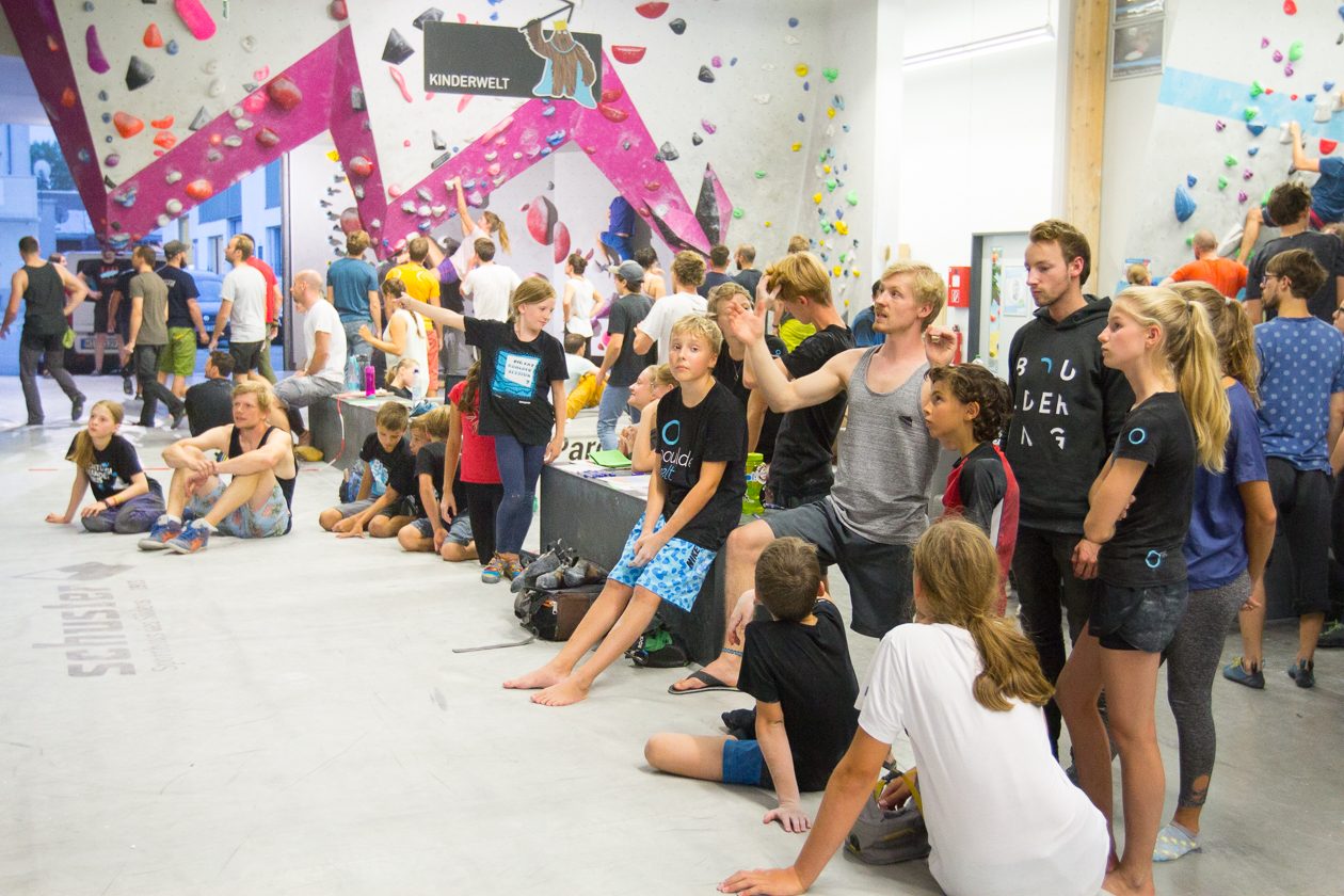 Michi ist extra mit seinen Kids aus der Boulderwelt München West angerückt, damit wir für alle Youngsters Gruppen zum Schuljahres Anfang zum aller ersten Mal eine übergreifende Wettkampfsimulation machen konnten. Jedes Kind durften sich an jeweils vier der acht Boulder, entsprechend seines Niveaus, innerhalb des Intervallmodus ausprobieren. Intervallmodus bedeutet, dass ein Starter nur 5 Minuten Zeit für einen Boulder hat. Wenn die Zeit abgelaufen ist, hat er 5 Minuten Pause bevor er zum nächsten Boulder darf. Und so weiter. Wer am Schluss die meisten Tops und Zonen in möglichst wenigen Versuchen geschafft hat, hat gewonnen.