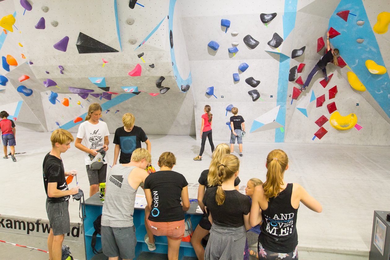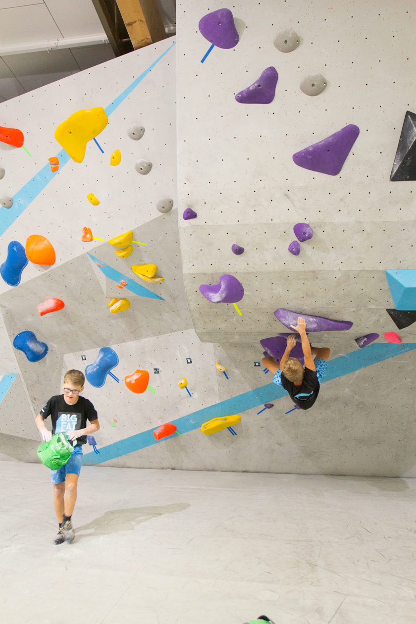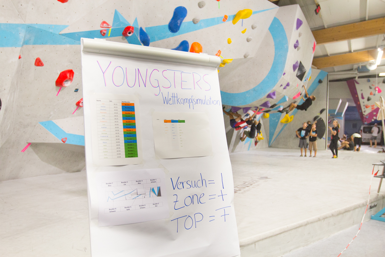 Michi ist extra mit seinen Kids aus der Boulderwelt München West angerückt, damit wir für alle Youngsters Gruppen zum Schuljahres Anfang zum aller ersten Mal eine übergreifende Wettkampfsimulation machen konnten. Jedes Kind durften sich an jeweils vier der acht Boulder, entsprechend seines Niveaus, innerhalb des Intervallmodus ausprobieren. Intervallmodus bedeutet, dass ein Starter nur 5 Minuten Zeit für einen Boulder hat. Wenn die Zeit abgelaufen ist, hat er 5 Minuten Pause bevor er zum nächsten Boulder darf. Und so weiter. Wer am Schluss die meisten Tops und Zonen in möglichst wenigen Versuchen geschafft hat, hat gewonnen.